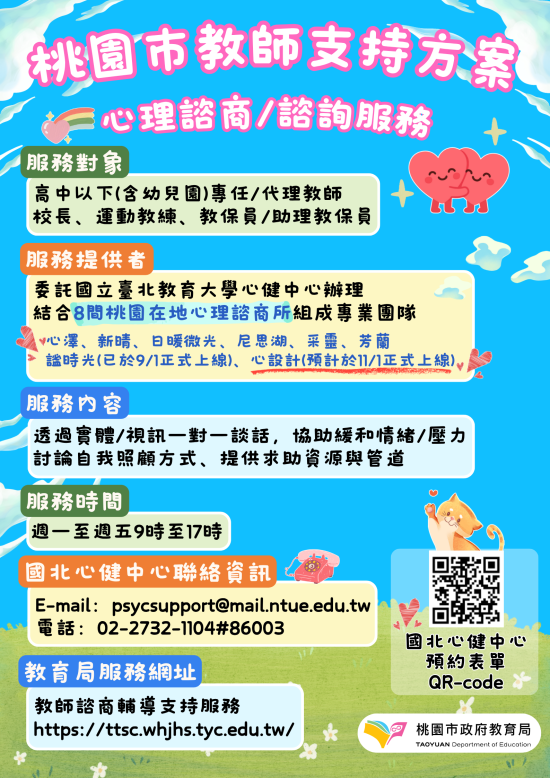 二、前揭相關資訊請參閱「桃園市政府教育局教師諮商輔導支 持服務」專頁(https://ttsc.whjhs.tyc.edu.tw/),若有 合作諮商所相關疑問,請逕洽國立臺北教育大學教師支持 方案專用信箱 psycsupport@mail.ntue.edu.tw 詢問,或致 電劉心理師(02)2732-1104#86003 。