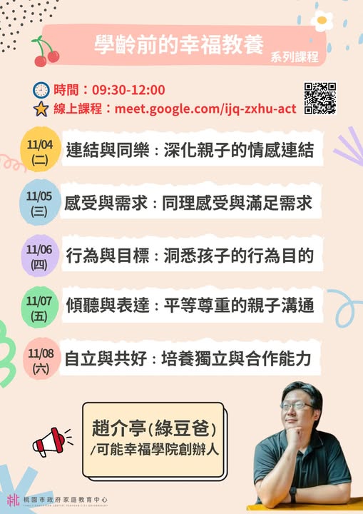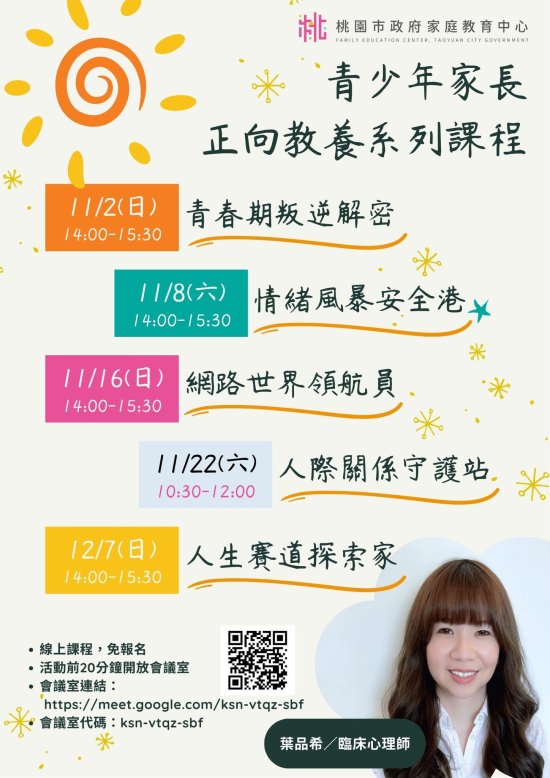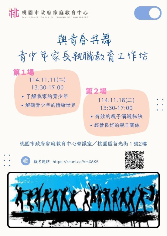 主旨:檢送本中心「小桃家 11 月課程資訊」、「青少年家長正向教養」、「邁向下一站幸福成長團體」、「學齡前的幸福教養」、「青少年家長親職教育工作坊」海報 1 份,惠請 貴機關(學校)運用多元管道宣導,請查照。