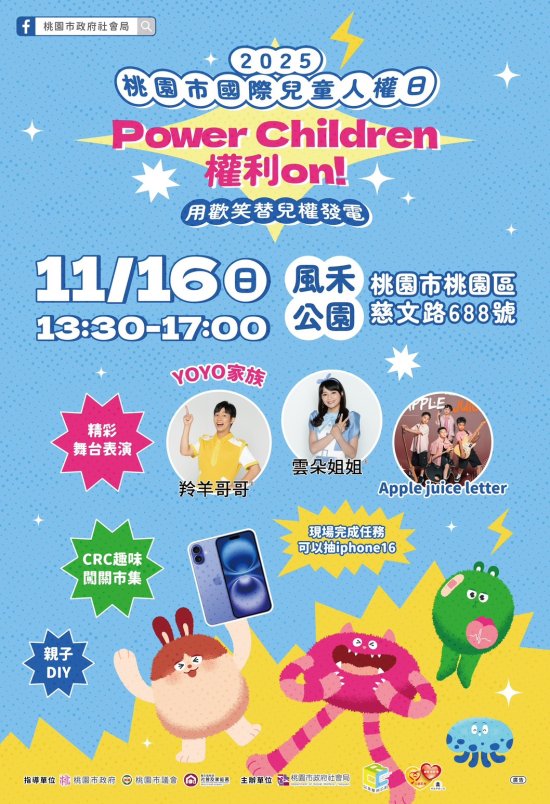 | 四、 | 另為提倡兒少表意權及參與公共政策權利,本府社會局已徵集兒少提案影片並進行人氣投票,人氣投票將於即日起至 11 月 14 日 20 時止,請協助推廣至本活動專區投票(https://sites.google.com/view/taoyuan-crc/)。 |