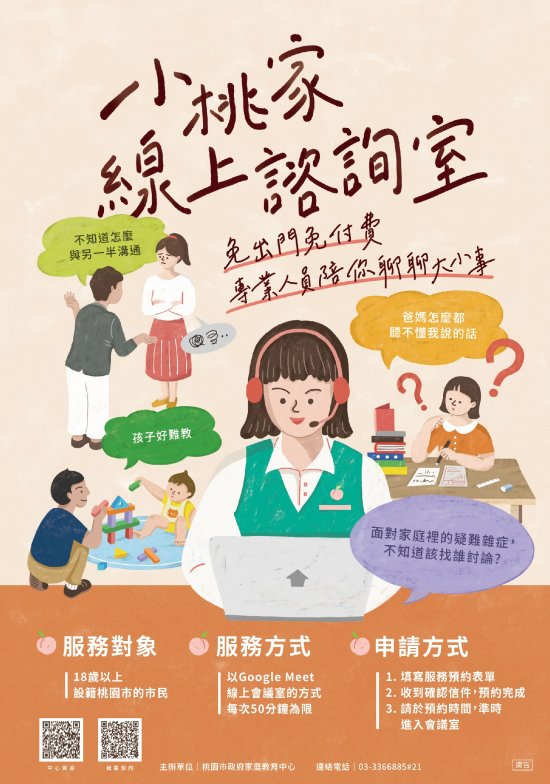 3、請於預約時間準時進入會議室。 二、檢送「小桃家線上諮詢室」海報電子檔 1 份(如印製海報需 要高解析度之檔案請至此網址下載 https://reurl.cc /g2b9GQ),請貴校協助周知有需求之家長使用。