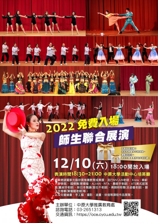 中原大學推廣教育處舉辦「2022師生聯合展演」海報1份,免費入場,歡迎踴躍參加