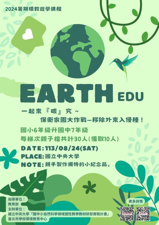 (一) | 旨揭課程係為達到環境永續發展的目標,以「一起來『碳』究」、「移除外來入侵種」及「DIY 手作體驗」3 大主軸,培養學童對於環境教育的認知。 |